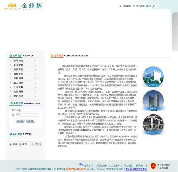 蘇州金螳螂構(gòu)筑裝飾股份有限公司創(chuàng)建于1993年1月,是一家以室內(nèi)裝飾為主體,融幕墻、家具、景觀、藝術(shù)品、機電裝備安裝、智能、廣告等為一體的專業(yè)扮裝飾團體。