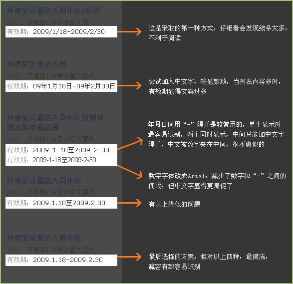最近設計一個優(yōu)惠券列表,有個屬性是有效日期,由于空間有限,必需要把開始日期和結束日期在一行顯示,這樣就泛起一排的數(shù)字,日期有好幾種我們習慣的格局,哪個更好?
