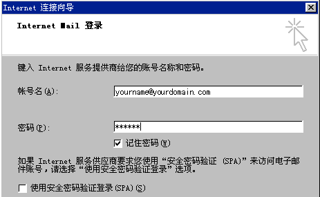 其中帳號(hào)名是您的郵箱地址,例如您的郵箱地址是yourname@yourdomain.com,則帳號(hào)名是yourname@yourdomain.com;為了確保安全,密碼顯示為星號(hào)。如果您沒(méi)有輸入密碼或輸入密碼有誤,系統(tǒng)會(huì)在接收郵件時(shí)提示您輸入密碼。