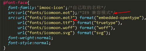 src:url("fonts/icomoon.eot") format("embedded-opentype"),/*后綴為eot,format對(duì)應(yīng)的字符串*/